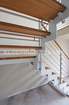 - The stepped 'zig-zag' stringers and the contrasting treads attract attention whereas the balustrade blends in and shows of the round oak handrail.